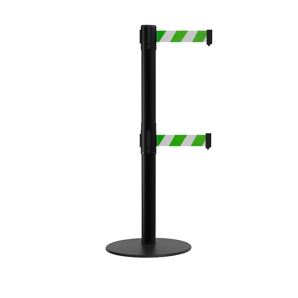 Stanchion Dual Belt Barrier Flat Base Black Post 9ft.Grn/Whi Belt
