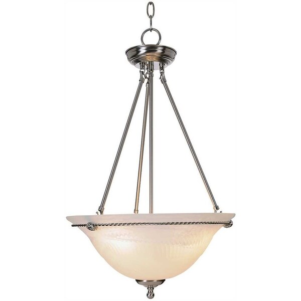 Relish in the design of this 3-light pendant; from the details in the alabaster swirl glass, to the double coated satin nickel finish, this pendant is not only durable, but a tastefully elegant showpiece. Three Light Pendant light in brushed nickel. The strong lines and sleek profile of this pendant light fixture make a bold design statement for any room. The popular appeal of brushed nickel and alabaster glass will blend well in any decor.Brushed nickel finishGlacier glass with swirl designUses 3 60-Watt medium base bulbs not includedMounting hardware includedAdjustable chain allows you to customize height of the pendant to meet your needsEasy installation instructions enclosed for convenient setupUL and cUL Listed for dry location