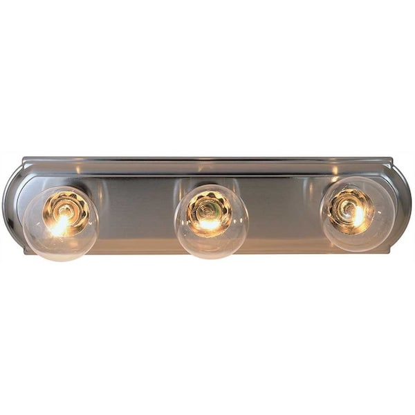 This 3-light Bath Vanity Light is sure to enhance your interior decor. It will give your bath or powder room a sleek and elegant upgrade. Featuring a brushed nickel finish, this fixture will provide plenty of brilliant and even illumination and easily complements a variety of decor. Easy to install, coordinate with other chrome pieces for a clean and polished look that you will enjoy for years to come. Its sleek design is not only appealing, but functional as well. This 3-light brushed nickel bath light with A19 bulbs is a great piece for highlighting a work-space or drawing attention to key objects. Damp Location Rated, UL and CUL Listed. Includes assembly and install parts: backplate, screw, socket rings, wire connectors, ground screw, outlet box screws, nipple, hex nut and mounting strap.Brushed Nickel finish complements many decor stylesEasy Install: includes all mounting hardware for quick and easy installationUses 3 incandescent A19 bulbs with a maximum of 60-Watt not includedCan be mounted on a wall or a ceilingInstalls directly to the junction boxWall mount is UL listed, UL approved for damp areas and is rated for 120-VoltsIncludes assembly and install parts: backplate, screw, socket rings, wire connectors, ground screw, outlet box screws, nipple, hex nut and mounting strap