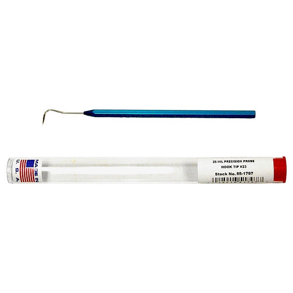Precision Probe, Handle Material Aluminum, Handle Style Hex, Overall Length 5 3/4 in, Tip Material Stainless Steel, Tip Style Hook, Tip Thickness 25 mil, Product Type Precision Probe, Handle Length 4 1/2 in, Shank Diameter 1/24 in
