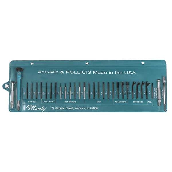 Slotted 0.055 in , 0.070 in , 0.080 in , 0.100 in , Phillips #00, #0, #1, Star T5, T6, T7, TR8, TR9, TR10, Hex 0.028 in , 0.035 in , 0.050 in , 0.062 in , 0.078 in , 0.093 in , Nut Drivers 7/64 in , 1/8 in , 5/32 in , Open End Wrenches 7/64 in , 1/8 in , 5/32 in , 3/16 in , Awl, (2) Handles