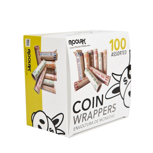 100 MOOLAH burst-resistant preformed coin wrappers, nested to save space. Contains 25 each of each denomination (quarter, dime, nickel, and penny). Madefrom sustainably sourced kraft paper certified to the Sustainable Forestry Initiative Standard. Federal Reserve and ABA compliant. Pre-crimped at one end, you’ll quickly and easily be able to fill these preformed coin wrappers by hand or in your favorite coin sorting machine. Perfect for small and large businesses, banking, education, and savings.