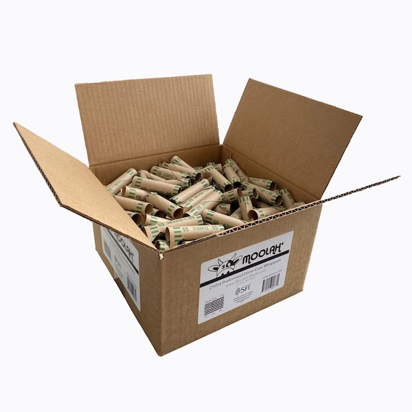 250 MOOLAH burst-resistant preformed dime coin wrappers. Madefrom sustainably sourced kraft paper certified to the Sustainable Forestry Initiative Standard. Federal Reserve and ABA compliant, each roll holds 50 dimes. Pre-crimped at one end, you’ll quickly and easily be able to fill these preformed coin wrappers by hand or in your favorite coin sorting machine. Perfect for small and large businesses, banking, education, and savings.