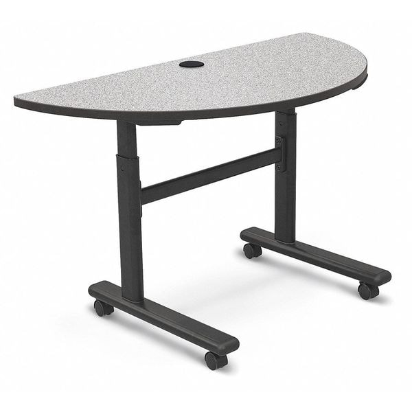 Seminar/Training Table, Surface Material High Pressure Laminate, Half Round, Width 48 in, Length 56 In., Height 29 in to 45 in, Tabletop Color Family Gray, Tabletop Color Gray Nebula, Frame Color Black, Assembled/Unassembled Unassembled, Frame Material Steel, Edge Color Black, Edge Type PVC Edgeband, Leg Type Comfort Leg, Top Thickness 1 in, Series Flipper, Load Rating 300 lb, Standards SCS Indoor Advantage Gold, Includes Stabilizing Stretcher Bar