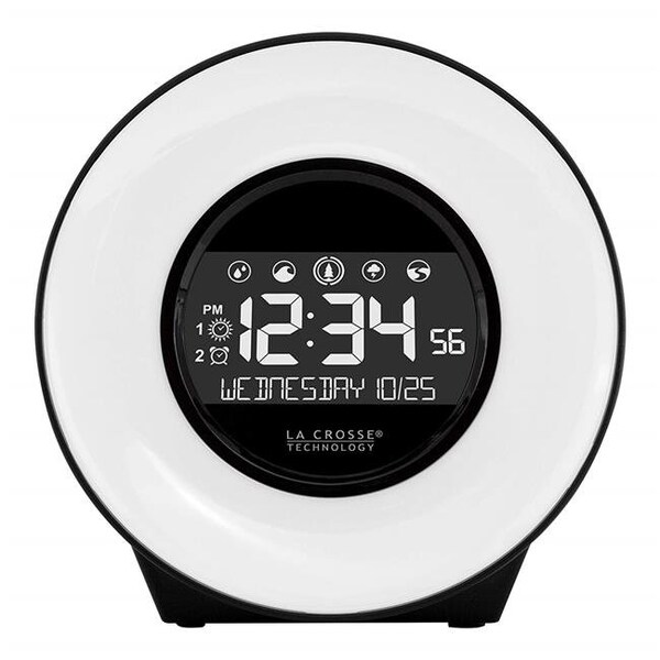 Uniquely designed mood light alarm clock, equipped with a variety of nature sounds that are sure to soothe even the most stressful of days. This easy-to-use alarm allows you to choose from seven different light colors depending on your mood, and if you can’t decide on one, simply set it to cycle mode and watch each color fade into the next. We know how difficult it can be to sleep with a bright light next to you in bed, so not only was the mood light designed with five different brightness level settings, but so was the LCD display. Fall asleep to the soothing sound of a flowing river, and WAKE up to seagulls chirping while ocean waves crash into the beach. With five different nature sounds to choose from, you will WAKE up as peacefully as you fell asleep. Before heading to bed, use the sleep timer to program a nature sound of choice to play for 15 all the way up to 90 minutes before bed, and do not forget to set your snooze timer for those of us who always want just 10 more minutes of sleep. Whether you need a quick break before dinner or in between classes, the Nap timer allows you to take a 5-120 minute Nap without disrupting your previous set alarms. Here at La Crosse Technology, our creative team always designs with you in mind. Use the 1 amp USB charging port to charge your phone or other device without taking up unnecessary space on the Outlet. The rubber feet keep the alarm from sliding around while programming or hitting the snooze button, and each button is designed a little different allowing for easy set up. The mood light alarm clock with nature sounds makes the perfect addition to bedside of all ages.