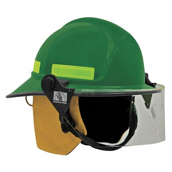 Fire Helmet, Modern, Green, FYR-Glass Shell Shell Material, Fits Hat Size 6 to 9-1/2, Nomex(R) Quick Release and Postman Slide Chin Strap, 8 pt Ratchet Suspension, Includes Cotton Ear Covers, Clear APEC Hi Temp Faceshield, Indura Cotton Headband Ratchet Cover, Standards NFPA 1971, Current Edition