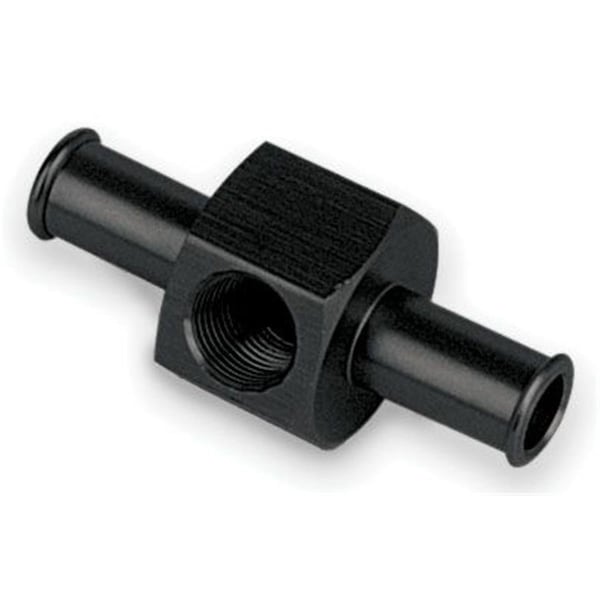 Features Allows Easy Plumbing Up To 1 8 in. NPT Fuel Pressure Gauge Lines Saves Wear And Tear On Carb Inlet Fittings By Allowing Quick And Easy Disconnecting Of Fuel Lin. Anodized Aluminum End Type1 - Hose Barb End Size1 - 3 8 in. End Type2 - Hose Barb End Size2 - 3 8 in. Type - Straight Side Port Size - 1 8 in. NPT Finish - Anodized Color - Black Material - Aluminum