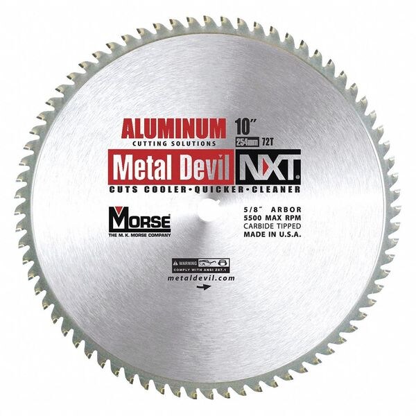 Circular Saw Blade, Blade Dia. 10 in, Diamond Knockout No, Number of Teeth 72, Tip Material Carbide, Hook Angle 10 Degrees , Tooth Grind TCG, For Use With Saw Type Miter Saws, Radial Arm Saws, Table Saws, Blade Type Metal Cutting, Plate Thickness 0.071 in, Application For Cutting Aluminum, Brass, Copper and other Non Ferrous Metals