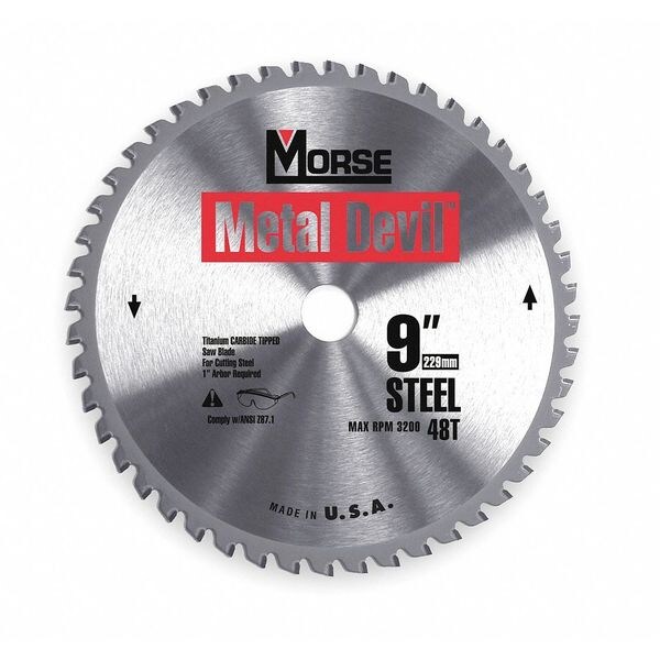 Circular Saw Blade, Blade Dia. 9 in, Diamond Knockout No, Number of Teeth 48, Tip Material Carbide, Hook Angle 10.0 Degrees , Tooth Grind ATB, For Use With Saw Type Metal Cutting Saws, Blade Type Metal Cutting, Plate Thickness 0.063 in, Application For Cutting Ferrous Materials Including Pipe, Angle Iron, Metal Studs and Conduit