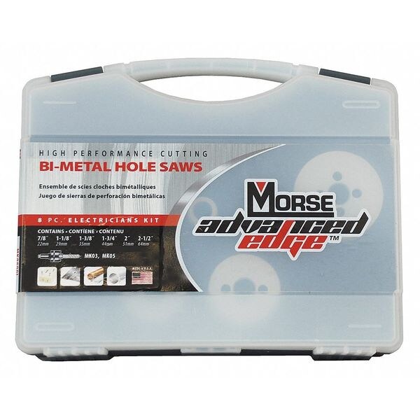 Electricians Hole Saw Kit, Arbor Design Included, Tooth Material Bi-Metal, Teeth per Inch 5, Max. Cutting Depth 1 1/2 in, Impact Rated No, Thread Size 1/2 In.-20, 5/8 In.-18, Shank Size 3/8 in Hex, 7/16 in Hex, Pilot Drill Size 1/4 in dia x 3 1/16 in L, 1/4 in dia x 4 5/16 in L, Number of Pieces 8