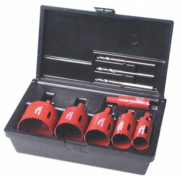 Electricians Hole Saw Kit, Arbor Design Built-In, Tooth Material Bi-Metal, Teeth per Inch 5, Max. Cutting Depth 1 1/2 in, Impact Rated No, Shank Size 7/16 in Hex, Pilot Drill Size 1/4 in dia x 4 5/16 in L, Number of Pieces 9