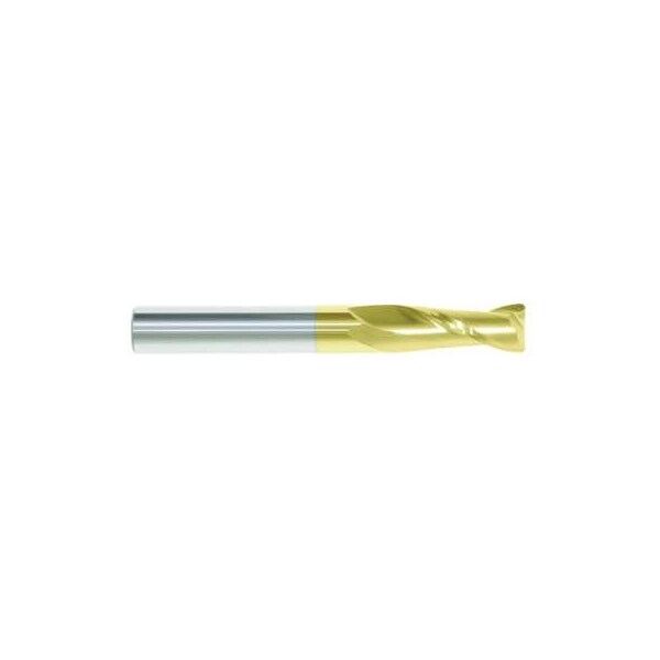 pMorse End Mill, Center Cutting Regular Length Single End, Series 5967G, 14 in Cutter Dia, 006 in Corner Radius, 212 in Overall Length, 34 in Maximum Depth of Cut, 2 Flutes, Spiral Flute, 14 in Shank Dia, Right Hand Cutting, 30 deg Helix Angle, PlainRound Shank, Micrograin Solid Carbide, TiN Coatedp