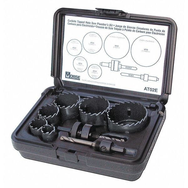 Electricians Hole Saw Kit, Arbor Design Included, Tooth Material Carbide Tipped, Teeth per Inch 3, Max. Cutting Depth 1 1/2 in, Impact Rated No, Thread Size 1/2 In.-20, 5/8 In.-18, Shank Size 3/8 in Hex, 7/16 in Hex, Pilot Drill Size 1/4 in dia x 2 7/8 in L, 1/4 in dia x 4 in L, Number of Pieces 8
