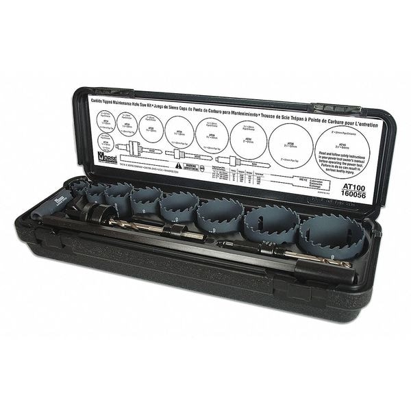 Maintenance Hole Saw Kit, Arbor Design Included, Tooth Material Carbide Tipped, Teeth per Inch 3, Max. Cutting Depth 1 1/2 in, Impact Rated No, Thread Size 1/2 In.-20, 5/8 In.-18, Shank Size 1/4 in Round, 7/16 in Hex, Pilot Drill Size 1/4 in dia x 4 5/16 in L, Number of Pieces 13