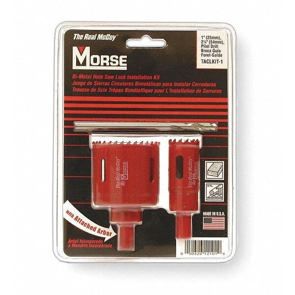 Locksmiths Hole Saw Kit, Arbor Design Built-In, Tooth Material Bi-Metal, Teeth per Inch 5, Max. Cutting Depth 1 1/2 in, Impact Rated No, Shank Size 7/16 in Hex, Pilot Drill Size 1/4 in dia x 4 5/16 in L, Number of Pieces 3