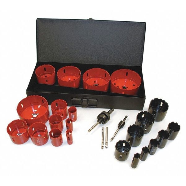 Plumbers Hole saw Kit, Arbor Design Included, Tooth Material Bi-Metal and Carbide Grit, Teeth per Inch 5, Max. Cutting Depth 1 1/2 in, Impact Rated No, Thread Size 1/2-20 and 5/8-18, Shank Size 1/4 in Hex and 7/16 in Hex, Pilot Drill Size 1/4 in dia x 3 1/16 in L and 1/4 in dia x 4 5/16 in L, Number of Pieces 28