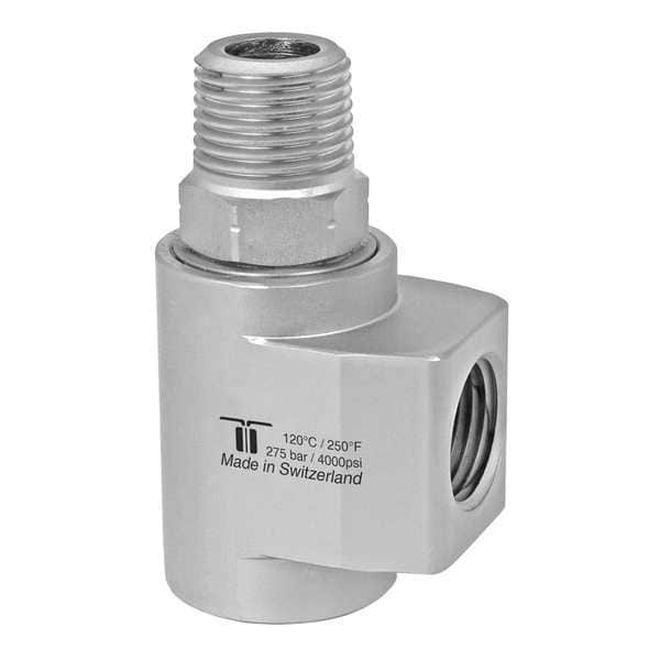 Rotary Union, Fitting Material Brass, Internal Fitting Material Stainless Steel, Fitting Material Finish Nickel-Plated, Internal Fitting Material Grade 304, Fitting Type Elbow, Flow Direction Single-Flow, Maximum Operating Temperature 250 Degrees F, Maximum Speed 200 RPM, Minimum Operating Temperature Not Applicable, Number of Passages 1, Overall Length 1.77 in, Pipe Size Not Applicable, Rotating Shaft Connection Type NPTF, Rotating Shaft Thread Size 1/2 in, Seal Material Nitrile Rubber