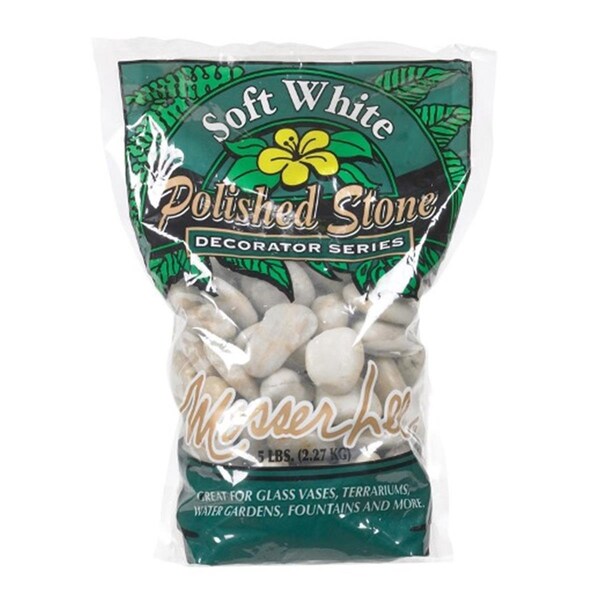 Decorative soil cover. Add a final touch of beauty and protection to all potted plants, terrariums & indoor gardens. Adds color, texture and variety to houseplants. Protects soil and retains moisture. . . Features 5 lb. White polished stone Add a final touch of beauty and protection to all potted plants, terrariums and indoor gardens Protects soil and retains moisture Adds color, texture and variety to houseplants Specifications Dimension: 2.5in H x 7in W x 11in L Weight: 5 lbs