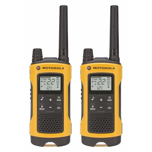 Handheld Two Way Radio, Band Type FRS, GMRS, Radio Transmission Analog, Digital Radio Technology Not Applicable, License Required No, Programming Requirements Pre-Programmed, Number of Channels 22, Output Power 5 W, Minimum Frequency 462 MHz, Maximum Frequency 467 MHz, Display Type Alphanumeric, Subscription Type Not Applicable, Radio Series Talkabout T400, Battery Life 8.5 to 21 hr, Number of Radios Included 2, Waterproof No, Repeater Capable No, Intrinsically Safe No