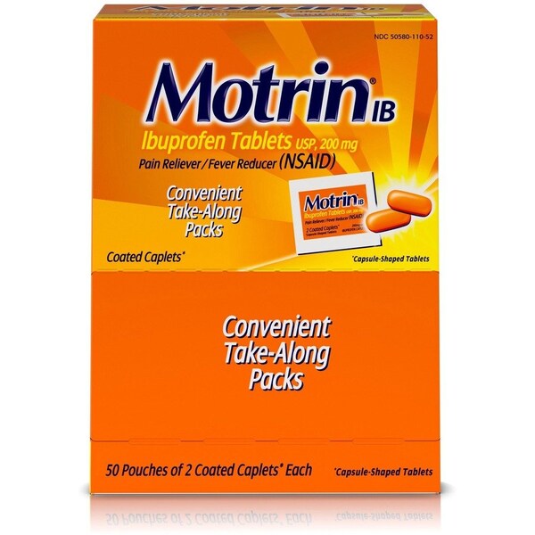 Motrin Ibuprofen is used for temporary relief of headaches, muscular aches, the minor pain of arthritis, toothache, backache, minor aches and pains associated with common cold, pain of menstrual cramps and reduction of fever. Each single dose of two tablets is individually wrapped.