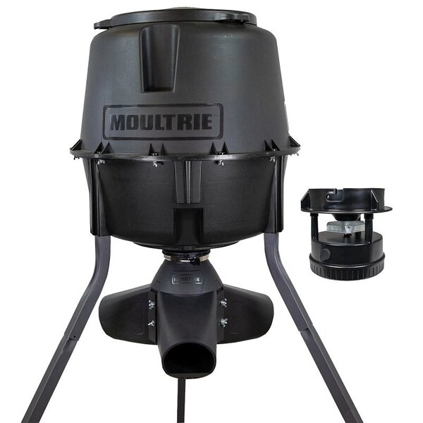 The 30 gal hopper will hold 200 lb of corn per fill The kit includes the AllInOne timerspinner kit that allows for up to four daily feed times with 1 to 20 s duration The spinner kit will last up to four months on four AA batteries The gravity kit also includes the gravity kit attachment which includes three feeder funnels with adjustable flow The MOULTRIE 30 gal gravityspin tripod combo gives you the flexibility you need regardless of the task Once season ends and it's time to feed protein, simply remove spinner kit and twist on the gravity kit The gravity kit includes three feeder funnels with adjustable flow This gravity kit is ideal for feeding deer highquality protein during the spring and summer antler growing season No matter how you choose to feed, the 30 gal tripod gravityspinner combo kit has you covered