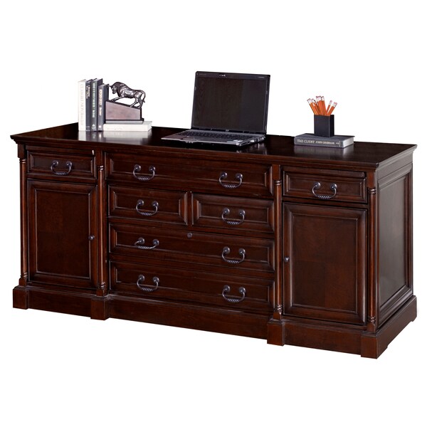 Inspired by the kathy ireland HomeTM Americana Style GuideTM, Mount View offers contemporary conveniences with traditional design elements for today's home and executive office. Holding true to traditional American beauty, this furniture collection boasts richly grained hardwood with cherry veneers and book matched panels. Incredible durability, style and adaptable configurations combine to form a timeless collection. The credenza includes a power center, a hidden CPU space, four utility drawers, and a letter/legal sized file drawer for storage.