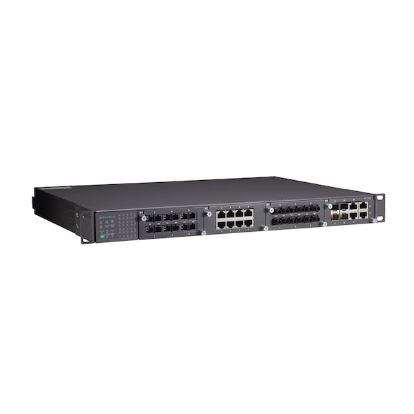 Modular Managed Ethernet Switch System with 3 slots for 100 Mbps modules, 1 slot for Gbps modules, Ethernet ports on rear panel, LED display on front panel, with one power input of 48 VDC, for a total of 24+4G ports