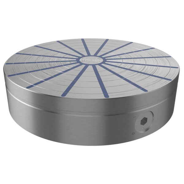 The MPI Double Rare Earth Round Chuck is primarily designed for turning and grinding round and ring-shaped workpieces. The compact top plate made of one piece of steel with radial poles offers the possibility to machine the front, inner and outer diameter of the workpiece in one operation. Holding force: 140N/cm2 / 203lbs/in2, Min. workpiece diameter: 35mm/1.38", Regrind limit 5mm/0.20"