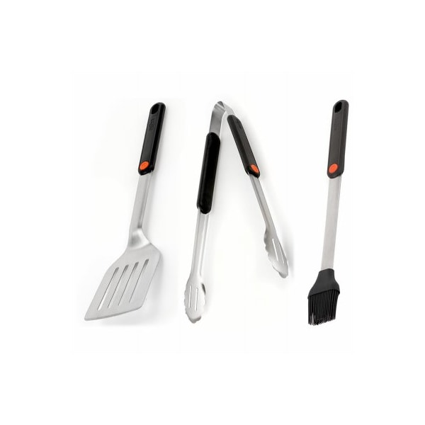 3 Piece Nested BBQ Tool Set: Spatula - Basting Brush - Tongs. Unique Q Branded Patented Plastic Handle. Non-Slip Professionally balanced. Stainless Steel Construction.