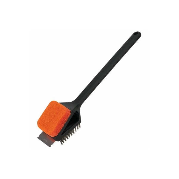 Long Handle Dual Head Grill Brush with Pad. includes stainless steel bristles scrub pad and steel scraper. CSA Z630-19 tested & approved for improved quality performance and safety.