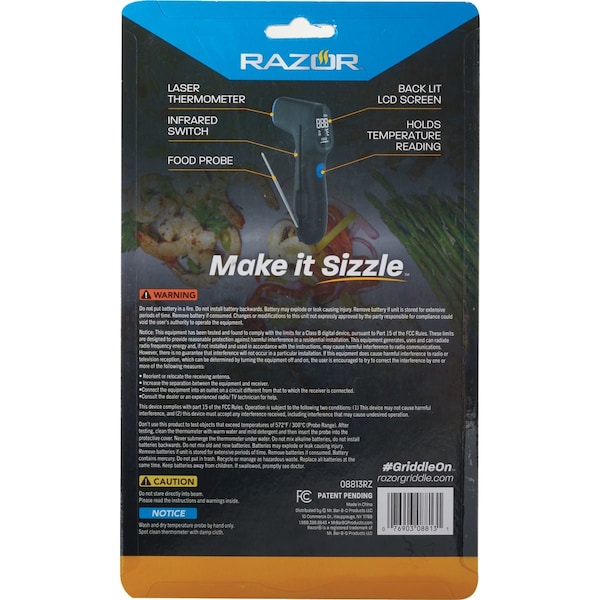 Never guess if your food is done with the Razor infrared thermometer with instant food probe. The high-tech laser scans and detects the surface temperature of the griddle for optimal time to start cooking. Insertable food probe reads the internal temperature of your meat for perfect doneness every time. The easy to read backlit LCD screen makes grilling in the dark a breeze. Digital infrared thermometer with laser detects griddle surface temperature and holds temperature reading. Combo infrared surface and instant read thermometer. Quick and accurate temperature readings. Thermometer probe range from -58 Deg F to 572 Deg F. Requires (2) AAA batteries not included.