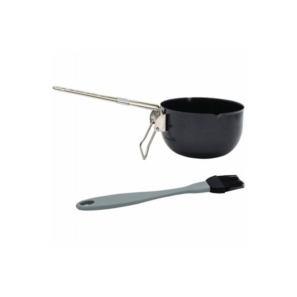 Sauce Pot & Baster patented kickstand feature - stabilizes sauce pot for easy / Safe use. Perfect For Sauces - black non stick sauce pot with grey plastic silicone baster. Gourmet Non-Stick Interior For Easy Cleaning. Silicone Bristles withstand heat up to 480 Degrees.