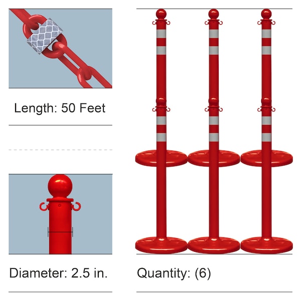 - Includes 6 medium duty reflective stanchions and 50 feet of 2 Inch reflective plastic chain