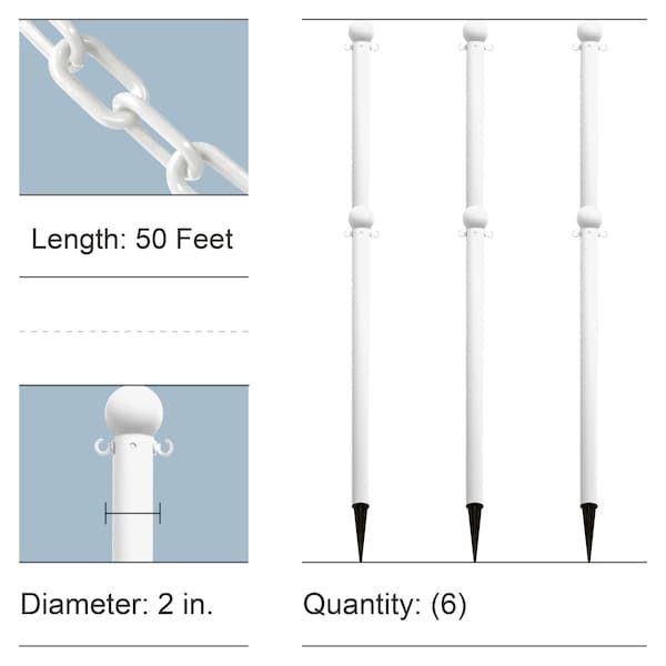 - Poles are approximately 35 inches in height by 2 inches in diameter and comes with 50 feet of 2 inch chain