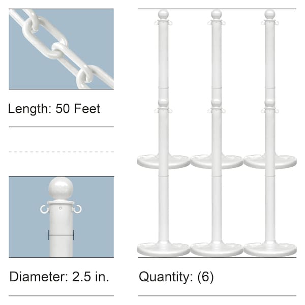 White Medium Duty Stowable Stanchion Kit and Chain, 6PK