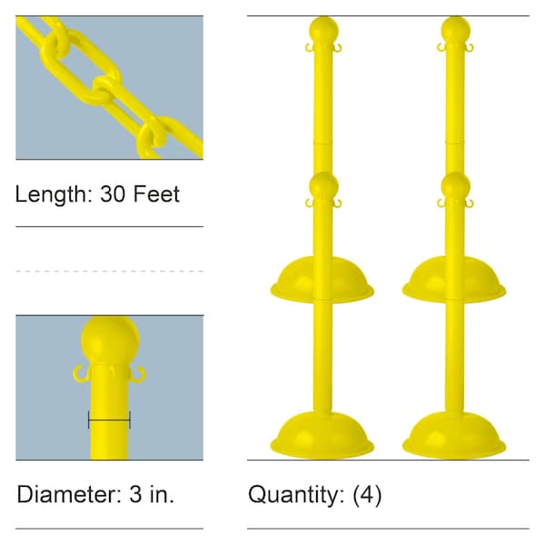 - Includes 4 stowable heavy duty stanchions and 30 feet of plastic chain.