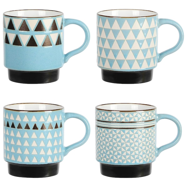 Have your favorite beverages in this stylish Mr. Coffee Primevalley 4 Piece 14 Ounce Stackable Assorted Wax Relief Triangle Design Mug Set. Each mug in this four piece set features its own unique and beautiful geometric design with white, blue, black, and bronze details. At 14 ounces, these mugs hold plenty of your drink of choice. These mugs are dishwasher and microwave safe making for easy everyday use and cleanup. Bring home a new and gorgeous mug set for your table today!
