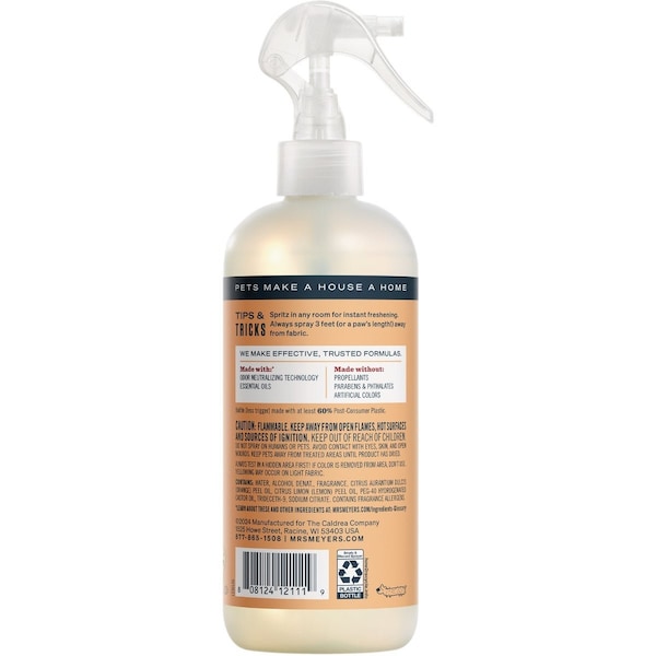 Mrs. Meyers Clean Day for your pets. Our new Pet Odor Neutralizer is tough on lingering pet smells and stinks in your home but friendly on whiskers and paws. This hardworking product not only adds instant freshness to air and fabric but it fights pet odors at the source instead of masking them. Its a little spritz-me-up for your home.