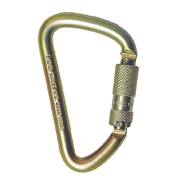Carabiner, Captive Eye or Pin Yes, Color Gold, Lock Type Auto-Lock, Gate Opening 7/8 in, Material Steel, Carabiner Shape Oval, Includes Retaining Pin No, Weight Capacity 360 lb, Overall Width 2 3/4 in, Inside Length 4 3/8 in, Inside Width 2 3/4 in, Overall Length 4 1/4 in, Tensile Strength 5,000 lb