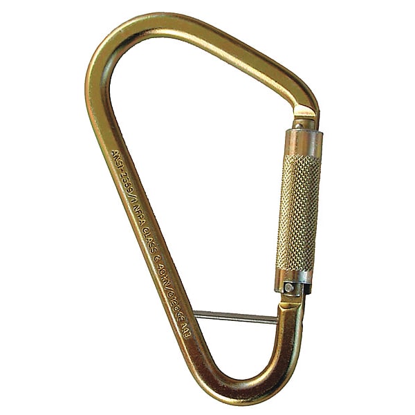 Carabiner, Captive Eye or Pin Yes, Color Gold, Lock Type Auto-Lock, Gate Opening 2 in, Material Steel, Carabiner Shape Oval, Includes Retaining Pin Yes, Weight Capacity 360 lb, Overall Width 4 1/4 in, Inside Length 8 in, Inside Width 4 in, Overall Length 8 1/4 in, Tensile Strength 5,000 lb