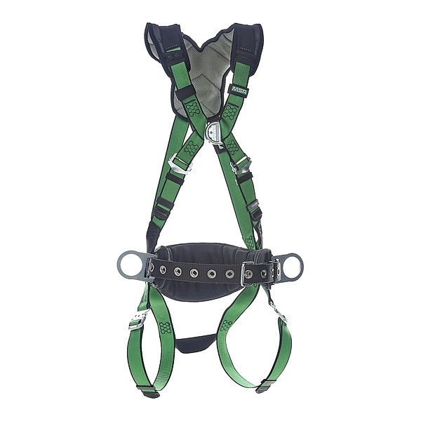 Fall Protection Harness, Harness Style Vest, Specialty Working Conditions Not Applicable, Safety Features Belt, Chest Strap Buckles Not Applicable, Harness Color Green, Harness D-Ring Material Steel, Harness Sizing M/L, Includes Padding Yes, Leg Strap Buckles Quick-Connect, Padding Location Shoulder, Torso Adjustment Mating, Weight Capacity 310 lb, Harness Application Climbing, Confined Spaces, Positioning, D-Ring Locations Back, Chest, Hips, RFID Equipped No, Industry Construction