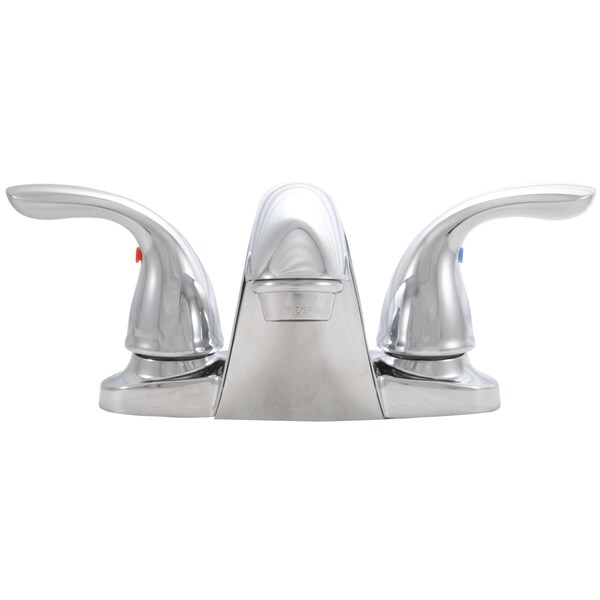 This attractive 4-ch centerset Bathroom Faucet features a contemporary spout a chrome finishing and easy-to-use handlesin. Discreet red and blue markgs allow for easy temperature controlin. It is available with a matching ABS Plastic pop up drain and a washerless cartridge to help prevent wear and tearin. The faucet also features a hybrid waterway and 1in. 2 GPM to conserve waterin.