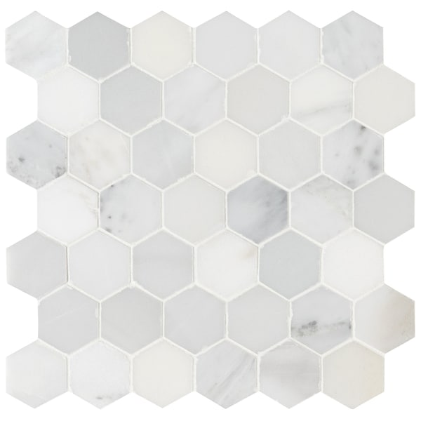 Use the Arabescato Carrara Hexagon Honed Marble Mosaic Wall Tile for your next installation or renovation project to incorporate a contemporary aesthetic into your decor. This attractive tile features in. hexagonal pieces on a mesh sheet that makes installation a much easier process. A smart blend of elegant white tones create a stylish complement for a wide variety of design schemes. This tile is constructed from durable marble material and is ideal for a variety of wall or floor applications. Note: Inspect all tiles before installation. Natural stone products inherently lack uniformity and are subject to variation in color, shade, finish etc. It is recommended to blend tiles from different boxes when installing. Natural stones may be characterized by dry seams and pits that are often filled. The filling can work its way out and it may be necessary to refill these voids as part of a normal maintenance procedure. All natural stone products should be sealed with a penetrating sealer.
