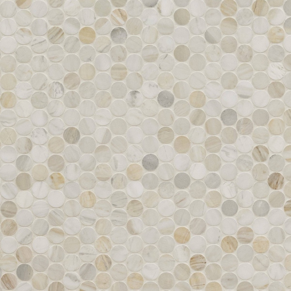 This MSI’s Athena Gold Penny Round marble mesh-mounted mosaic tile, sections for ease of installation and offers a lovely marble look with stunning whites that delivers class and graceful style . this tile features in. mesh-mounted mosaic sheet with a smooth finish and can be used for whole floors or wall sections or trimmed to provide a striking accent as desired. use the tile in various areas around the home for medium-duty flooring such as in kitchens, hallways or even outside around terraces or balconies. the slipesistant design is recommended for indoor use.