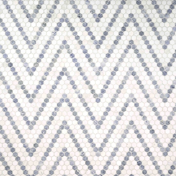 Introducing the captivating MSI Azula Sazi Mosaic Tile, where a stunning blend of 1'' hexagon marble tiles in mesmerizing white, gray, and blue tones are expertly arranged in an eye-catching zig-zag pattern, all showcasing a refined polished finish. Elevate your space with these enchanting mesh-backed mosaics, perfectly suited for creating stylish accent walls, backsplashes, and even residential floors. Designed with versatility in mind, they effortlessly complement a diverse selection of tiles within the Azula Collection, seamlessly harmonizing with various other natural stone tiles and slabs available in our inventory. Discover the epitome of allure and sophistication with these extraordinary mosaic tiles.