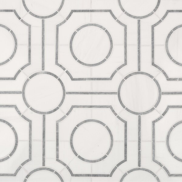 Introducing the exquisite Bianco Dolomite Regency wall tile, a stunning blend of natural stone elegance and modern design. Crafted from pristine white marble with a polished finish, this tile boasts a captivating gray geometric pattern that adds a touch of sophistication to any space. Its cohesive design and timeless appeal with a unique aesthetic make it the perfect choice for a variety of wall applications, including backsplashes and accent walls in both residential and commercial settings. Additionally, its durability and versatility extend to residential flooring, ensuring a harmonious and luxurious atmosphere throughout your space. Its mesh-backed mosaic installation offers ease and precision, making your design dreams effortlessly achievable with this remarkable tile. Elevate your interior with the timeless beauty of Bianco Dolomite Regency, where natural elegance meets contemporary style.