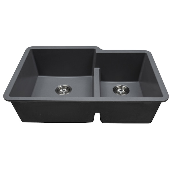 This sophisticated Gray Quartz Double Bowl undermount sink showcases scratch, stain, and germ resistance. It features a combination of one large and one smaller basin 60/40 to accommodate large cookware such as large stockpots and baking sheets, while also keeping everyday glasses and dishes separate and secure. Tailored for busy homes and light commercial environments, this quartz sink displays impressive heat resistance, and its robust construction ensures superior sound absorption. Its matte finish effectively minimizes water spots, while the UV protected surface safeguards against fading. This sought-after quartz sink seamlessly blends enduring quality with elegance.