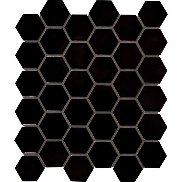 MSI retro nero in. Hexagon mm glossy are Black porcelain mosaic wall tiles with in. hexagon shapes in glossy black. the durable tiles are greenguard indoor air quality certified for peace of mind and perfect for residential and commercial countertops, backsplashes, accent walls, and feature walls as well as residential flooring. they also pair well with a wide variety of subway tile, arabesque tile, or ceramic wall tile from MSI’s inventory.