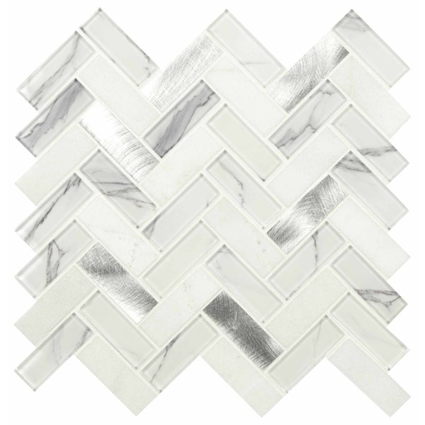 Enhance your home's walls or countertops with this Bytle Bianco Herringbone glass metal and stone mesh-mounted mosaic wall tile. crafted from an unglazed finish with a high/low sheen, these wall tiles feature subtle tone variations for character. they are perfect choice for a kitchen backsplash, bathroom shower or accent wall. the impervious tiles are arranged on a mesh sheet for worry-free installation. these durable, frostesistant wall tiles are constructed from metal and honed marble that is suitable for installation on walls.