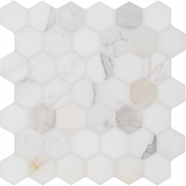 Refresh the look of your home and add contemporary style with this MSI Calacatta Gold Hexagon mesh-mounted mosaic floor and wall tile. it features white and gray tones with streaks of gold that is perfect for kitchens and bathrooms. this mosaic has in. hexagon chips on in. by in. mesh sheets that can be installed inside or outside residential or commercial spaces. note: please inspect all tiles before installation. natural stone products inherently lack uniformity and are subject to variation in color, shade, finish etc. it is recommended to blend tiles from different boxes when installing. natural stones may be characterized by dry seams and pits that are often filled. the filling can work its way out and it may be necessary to refill these voids as part of a normal maintenance procedure. all natural stone products should be sealed with a penetrating sealer.
